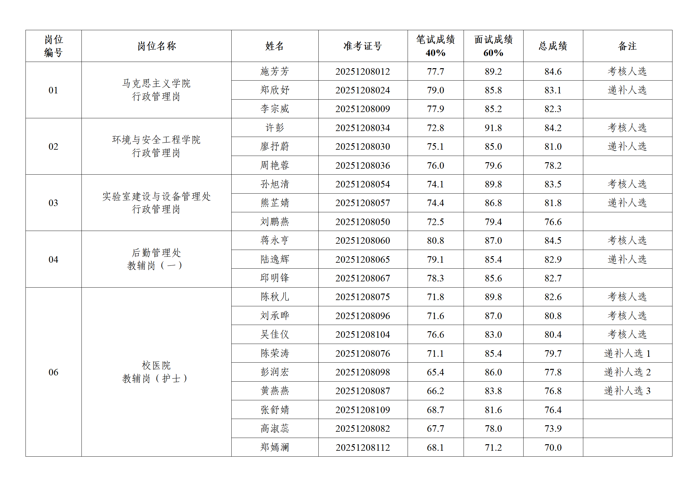 根据《2025年福州大学公开招聘编制外工作人员启事》、《福州大学公开招聘编制外工作人员考试工作的通知》等文件要求,现将入闱面试人员成绩以及考核人选、递补人选公布如下(各岗位按综合成绩排序)。